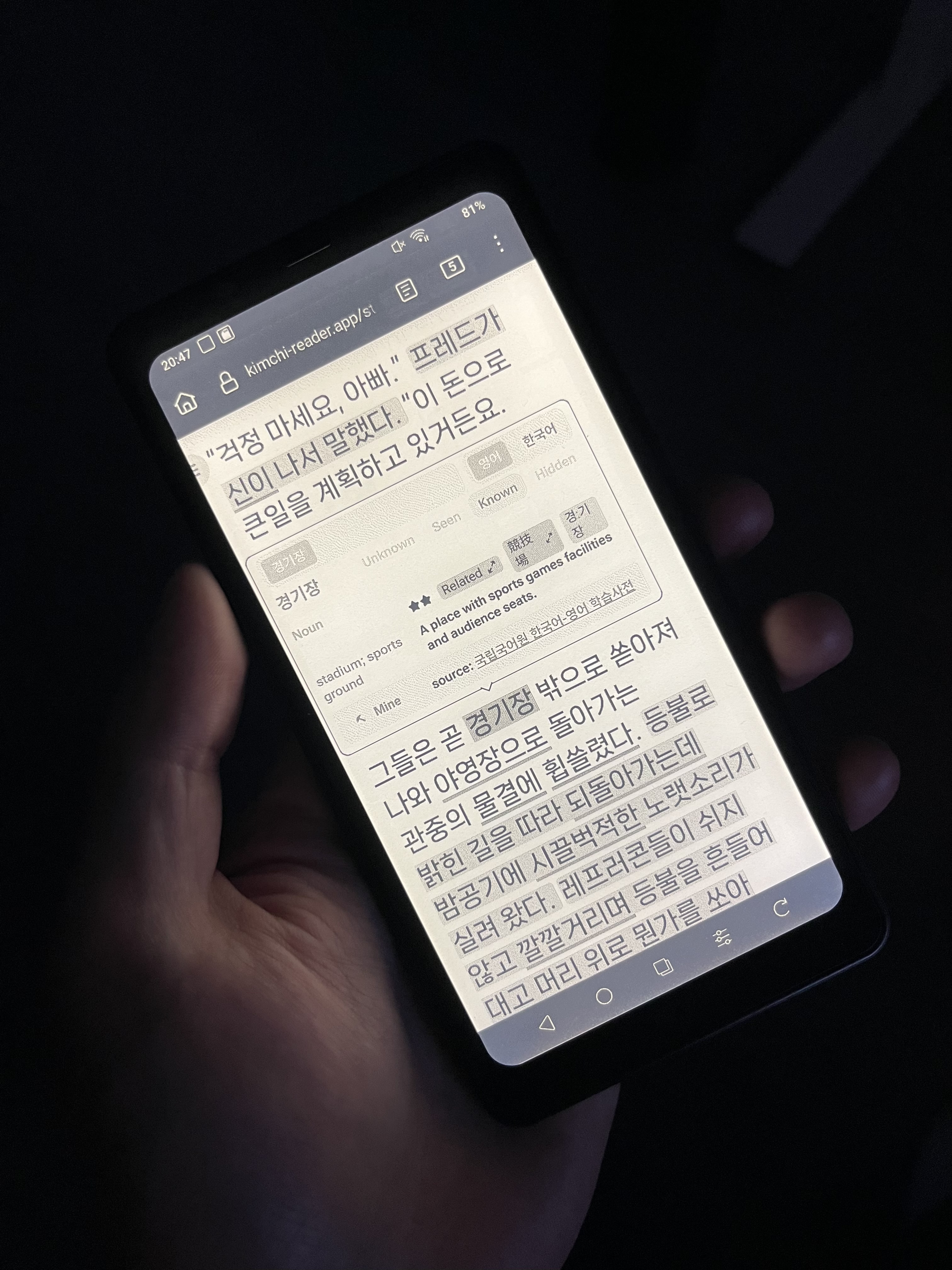 At the start of the month I purchased a Boox Palma. It's a smartphone sized e-reader that runs Android. It's basically a phone with an e-reader screen, but without any 4G/5G capabilities. I bought this to make it easier to read Korean on the go. I've used Kimchi Reader on my phone already quite a bit for this, but the screen of the Boox is just way nicer to read on. It also doesn't have all the distractions (and especially notifications) that my phone has.